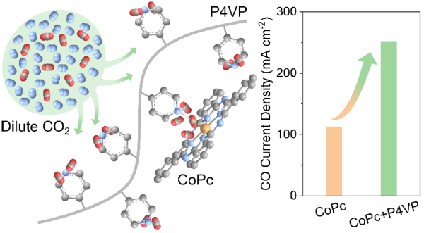 该团队利用分子修饰策略构建了有效耦合CO2捕获和转化过程的反应微环境,实现了低浓度CO2的直接电解转化。该研究采用商品CoPc作为模型催化剂,利用聚4-乙烯基吡啶(P4VP)进行电极修饰,在典型工业烟道气CO2浓度(10%)时,P4VP修饰的CoPc电极上CO法拉第效率达到90%以上,CO分电流密度达到252 mA/cm2,且CO分电流密度相比未修饰的CoPc电极提高了2.24倍。物理化学和电化学结构表征结果表明,P4VP的吡啶基团促进了CO2在CoPc催化剂中Co位点上的物理富集和化学活化,推进了低浓度CO2电解生成CO。结合进一步的催化剂结构设计和反应微环境调控,该分子增强策略有望实现工业烟道气直接电解及乙烯等C2+产物的高效制备。