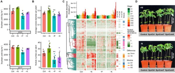 该研究通过持续40多年不施氮肥、磷肥或钾肥的黑土试验地发现,长期不施氮肥并不影响大豆的产量,甚至有平均9%左右的增产。定量微生物组分析结果表明,长期不施氮肥塑造了独特的根际微生物群落演替模式,长期不施磷肥则阻碍了根际微生物群落的发育,并普遍降低了根际微生物的丰度。该研究发现低氮条件增强了大豆与根瘤菌间的共生关系,且低氮富集的根际微生物合成群落能够通过产IAA、ACC脱氨酶以及溶解无机磷等多种有益功能促进大豆生长。这一基于定量微生物组的研究为根际微生物群落的动态组装提供了新见解,凸显了根际微生物群落在替代氮肥以保障大豆产量方面的潜能。上述成果加深了关于如何整合共生根瘤菌和有益的根际微生物群落以制备作物接种剂的认知,并为如何优化大豆的种植方式和减少氮肥的使用提供了参考。