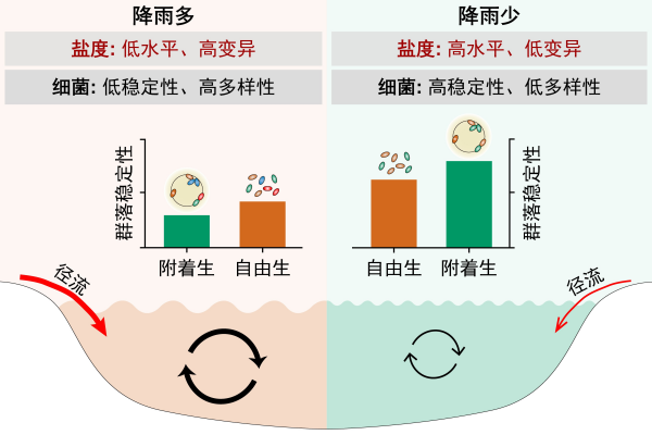 结果表明,伴随水体盐度的升高,自由生和附着生细菌群落组成稳定性均呈现增强趋势,而它们的α多样性呈现降低趋势。比较分析显示,在盐度高水平、低变异情景下,附着生细菌群落稳定性高于自由生细菌;在盐度低水平、高变异情景下,自由生细菌群落稳定性高于附着生细菌。进一步,研究表明,细菌性状(如基因组大小和稀有种互作强度)与降雨驱动的环境因素(如盐度和颗粒物)变化可能共同导致不同盐度情景下自由生和附着生细菌群落稳定性的差异。这一研究初步揭示了降雨、盐度、浮游细菌稳定性之间的内在关系,为气候变化条件下亚热带城市浅水湖库的生态管理、保护和修复提供了基础数据和科学依据。