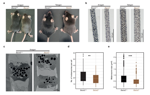 该研究使用CRISPR-Cas9基因编辑技术在C57BL/6J品系小鼠中构建了同源区段敲除的小鼠模型,发现所有Bace2-/-小鼠的毛色浅于野生型毛色。 显微观察发现,相较于1月龄生长期,4月龄休止期的小鼠毛发中色素缺乏的情况更为显著。研究对小鼠背部毛发进行透射电镜观察并统计单个细胞内的黑素体数量和截面积发现,Bace2-/-小鼠出现与棕色大熊猫相似的黑素体数量显著减少和截面积显著减小的现象。