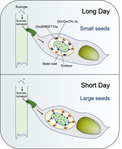 中国科学院华南植物园农业与生物技术研究中心侯兴亮课题组利用大豆重组自交系群体,通过图位克隆的方法鉴定到控制种子粒重的关键基因Dt1。进一步的研究发现,长日照条件下,Dt1在种子发育过程高表达,其蛋白与蔗糖转运蛋白GmSWEET10a相互作用,负向调节蔗糖从种皮向胚的输入,从而调节种子发育。然而,短日照光周期条件下,Dt1的转录水平较低,不参与种子发育调控。此外,研究发现了Dt1 的新自然等位基因(H4单倍型)。该单倍型可以解耦其对种子大小和生长习性的多效性作用即在种子发育调控中保持功能,但不影响大豆的茎生长习性。该成果为揭示不同纬度大豆种子发育对光周期的响应提供了新见解,并为通过控制种子粒重和生长习性来提高大豆产量提供了新的基因资源。