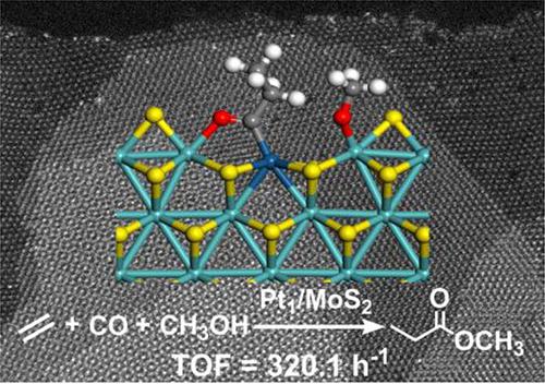 相关研究成果以Ethylene Methoxycarbonylation over Heterogeneous Pt1/MoS2 Single-Atom Catalyst: Metal-Support Concerted Catalysis为题发表在《美国化学会志》(Journal of the American Chemical Society)上。研究工作得到国家重点研发计划、国家自然科学基金、中国科学院稳定支持基础研究领域青年团队计划等的支持。
