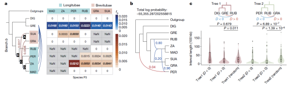 该研究解析了来自马达加斯加、塞内加尔和澳大利亚的8个猴面包树物种野生个体遗传信息,重建了猴面包树属演化历史,发现了其物种多样性分化始于距今约2100万年前。这一时间晚于非洲和澳大利亚板块的分离及马达加斯加岛的形成。综合数据分析表明,历史上包括已形成洲际隔离或岛屿同域分布的猴面包树物种均存在种间杂交情况,导致属内全基因组水平上系统发育关系信号的不一致性。依据该研究揭示的历史同域杂交式样和实际的跨洋扩散可能性,科研人员提出了马达加斯加岛应为现存猴面包树属冠群的起源分化中心。