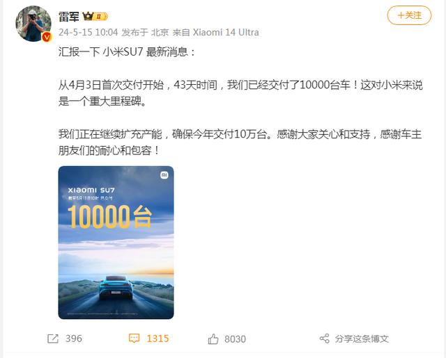 5月15日,小米集团董事长雷军在个人微博上公布了小米汽车的最新进展,小米SU7已经交付了一万台车。雷军称,公司正在继续扩充产能,确保今年交付10万台。