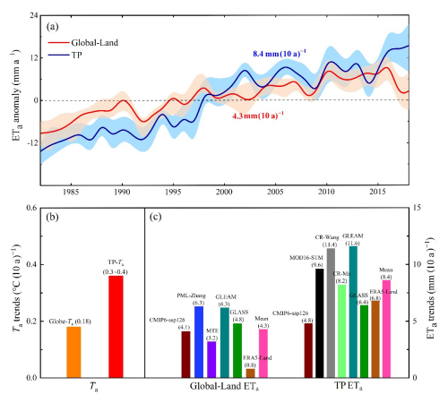 研究发现,1980年以来,青藏高原正在经历着显著的变暖过程,呈现出植被变绿、地表变湿和降水增加以及青藏高原中部和东部大部分地区的年平均蒸散发在过去40年呈显著增加的趋势。蒸散发的最强趋势出现在夏季和春季,而秋季和冬季的增长趋势较为接近。过去40年,高原年平均蒸散发增加了约35.5毫米,青藏高原年平均蒸散发增加了约9.4%,青藏高原蒸散发增加趋势为0.84毫米/年。1980年之后的全球变暖速率约是青藏高原变暖速率的一半,6种全球蒸散发数据统计得到全球陆地蒸散发趋势为0.43毫米/年。研究发现,青藏高原蒸散发的增长速率约是全球陆地蒸散发增长速率的两倍,这表明与全球水平相比,青藏高原过去40年表现出更强烈的水循环即高原水循环加速。