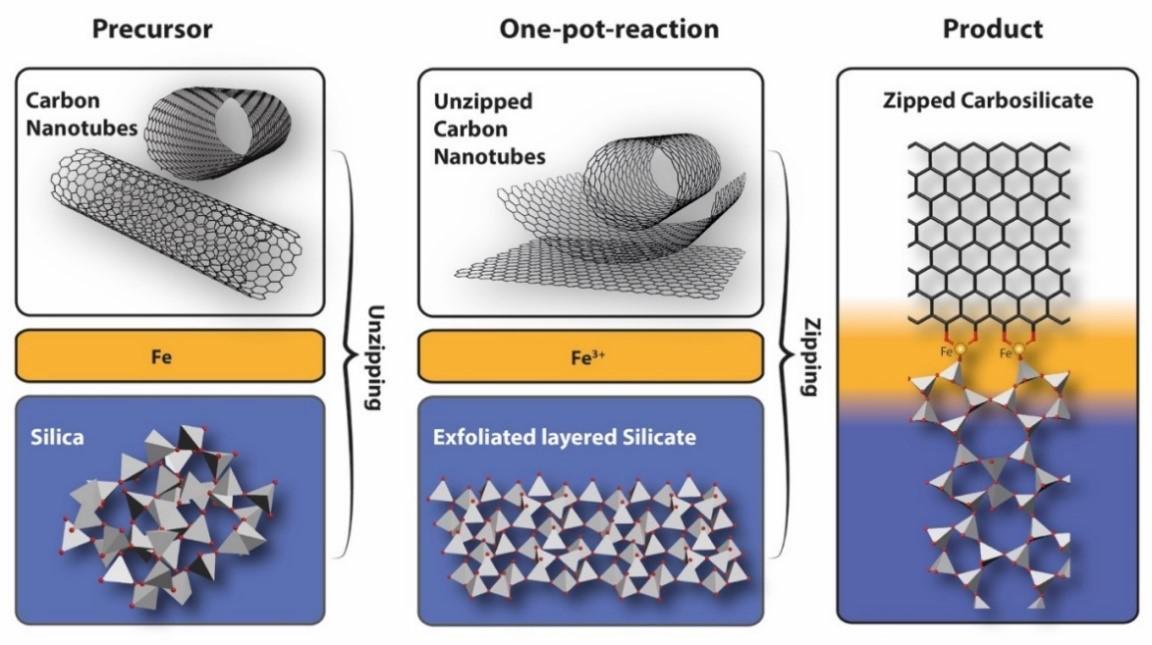 高性能纳米碳材料和超薄二维硅酸盐材料因其可设计性和广泛的性能调节空间在高端材料领域引起了关注。将这两类具有截然不同性能的纳米材料进行可控复合,无疑是拓展新材料以获得新性能的有效途径。碳材料存在化学惰性,因此之前的尝试多是通过物理复合的方式将这两种材料结合,以获得具有二者性能的复合材料。虽然这种方法相对简单,但在微尺度上难以保证均一性和复合程度,从而限制了其在高端领域的应用前景。如何通过稳定的化学键合实现这两种材料的化学复合,成为解决上述问题的关键。近日,中国科学院青岛生物能源与过程研究所等研究人员通过弱制氢反应驱动创造性地制备了一类新的碳和硅酸盐二维超薄复合材料,并命名为carbosilicate(碳硅酸盐),相应材料在电解水制氢过程中展示出优于商业IrOx的效果。通过协同作用,三种自身不能持续发生的反应(铁与水反应制氢,碳管形成石墨烯带,块体氧化硅分解重排形成二维硅酸盐层)在温和的水热条件下持续发生并化学键合,最终形成新的复合材料。