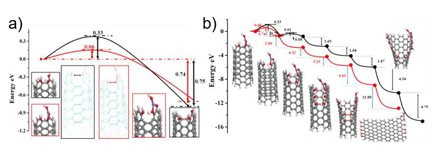 为了进一步探究反应机理,研究人员以AIMD模拟为主要手段,结合相应静态计算,研究了碳纳米管在含铁离子溶液中的“裂解”机理。结果表明铁离子的存在对碳纳米管的裂解具有重要促进作用,特别是在初步碳-碳键裂解过程中,有铁离子参与的第一个碳-碳键裂解能量(0.06 eV)比没有铁离子参与的裂解能量(3.3 eV)低了5倍。同时计算结果还表明溶液中氧(或氢氧根)的参与对碳纳米管的持续裂解起到关键作用。这些计算结果与实验结果相吻合,为实验提供了有力验证。