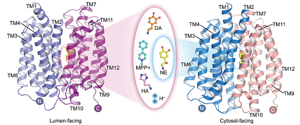 单胺类神经递质包括去甲肾上腺素、肾上腺素、多巴胺、血清素和组胺等,在神经系统和其他组织中发挥着重要的生理作用。囊泡单胺转运蛋白(VMAT2)是中枢神经系统中唯一介导单胺类神经递质储存的转运蛋白。VMAT2利用质子的电化学势,以2:1的质子与底物的化学计量比,将神经递质或神经毒素MPP+转运进入囊泡中,在介导神经冲动传递和神经保护方面具有关键作用。