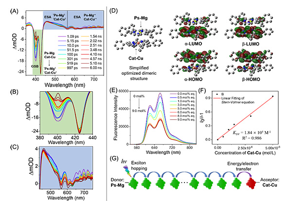该工作受蓝细菌藻胆体启发,人工组装体结构通过聚电解质PDDA模拟蛋白质骨架的同时利用金属卟啉模拟色素团分子得以实现。在水中,阳离子型PDDA与具有光敏和催化功能的阴离子型金属卟啉共组装生成一维光合组装体,从而模拟藻胆体棒状天线结构和催化中心(图1)。该光合组装结构可实现水相光催化产H2,其效率相比单体分子提升23倍以上。通过形成纳米组装结构,光敏和催化金属卟啉的光稳定性相对单体结构显著提升。研究进一步借助瞬态吸收光谱、荧光光谱和理论计算研究了光催化机制(图2)。光照后,研究通过飞秒级瞬态吸收光谱观察到有金属卟啉阳离子自由基生成,说明可能存在光诱导的电子转移过程;理论计算同时支持镁卟啉与铜卟啉之间通过电子转移生成电荷分离态。此外,荧光光谱和瞬态吸收光谱实验支持光合组装体内存在能量转移过程。因此,该仿生组装体系统中的光敏金属卟啉可以通过能量转移和电子转移协同过程使光能从光敏剂传递至光催化中心,从而实现了高效的水相光催化质子还原产H2。通过优化光催化条件,该组装体的光催化产H2性能显著优于其他金属卟啉组装体系。光照下,此光合组装体的产氢速率和转化数(TON)可达51,776 μmol h-1 g-1和1299。该研究不仅加深了科学家对天然藻胆体光合作用结构与机制的认知,而且为构筑水相仿生超分子光合组装体系统提供了新思路。