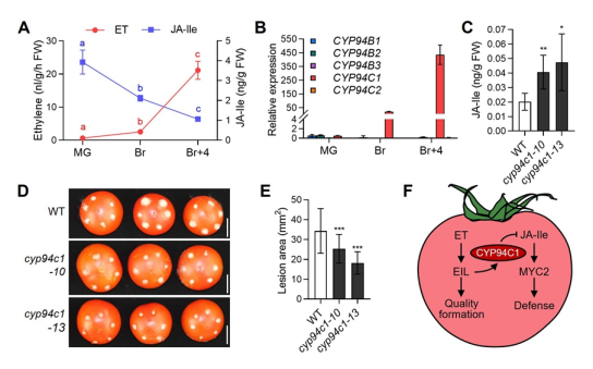 It should be emphasized that knocking out CYP94C1 specifically enhances the resistance of fruits to necrotrophic pathogens without altering the fruit ripening process, thus having no effect on sugar content, acid content, lycopene content, and vitamin C content. Therefore, this study not only reveals the molecular mechanism of reduced resistance during fruit ripening, but also provides genetic targets and technical means for solving the contradiction between quality and resistance in breeding and reducing post harvest losses.